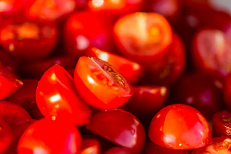 Group of fresh ripe cherry tomatoes selective focus macro shot with shallow DOF.