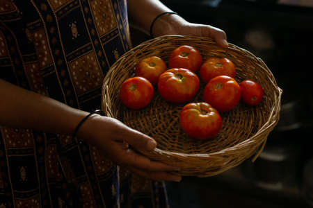 Fresh red tomatoes in a cane basket with selective focus