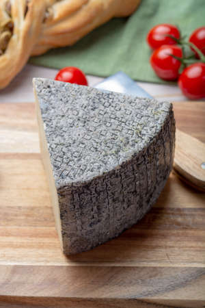 BELGRADE, SERBIA - NOVEMBER 22, 2018: Detail of Tomme Des Pyrenees cheese in Belgrade, Serbia. Tomme Des Pyrenees is a French rustic cheese, usually covered in a thin black skin.