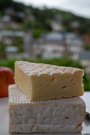 French squared pont l'eveque cow cheese from Calvados department served with apple and view on green trees and old houses of Etretat, Normandy, France
