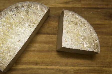 Two pieces of french hard cow or goat cheese Tomme or Tome, produced in French Alps
