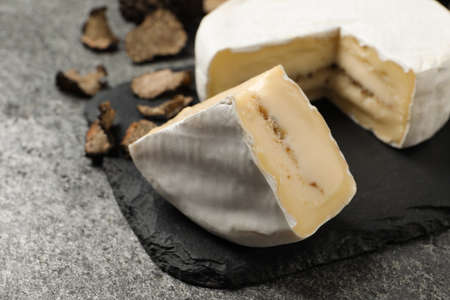 Close-up of French Camembert cheese, beautifully textured, placed on the counter and cut into pieces