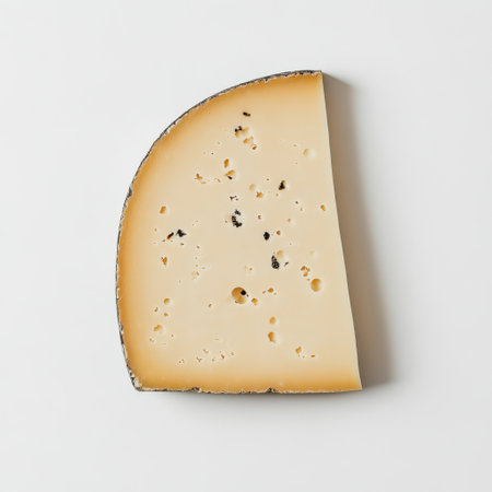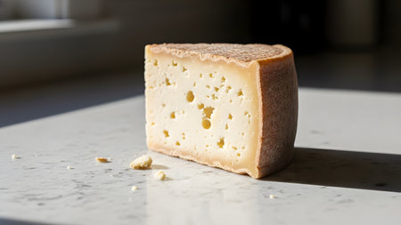 A wedge of semi-hard cheese with small holes sits on a white marble surface. The close-up shot captures the texture of the cheese and its natural rind under side lighting.