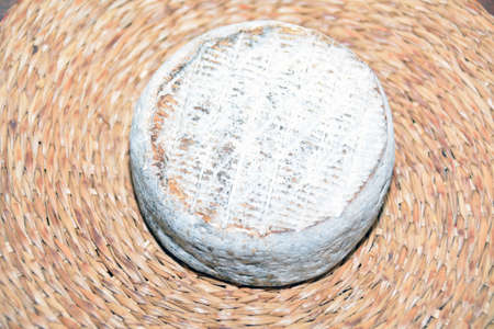 Cheese collection, piece of round fresh smoked Spanish goat cheese close up