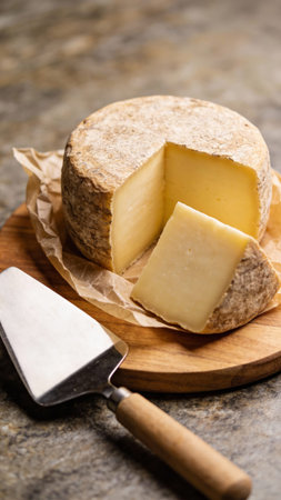 Artisanal aged cheddar wheel with a sliced wedge on brown baking paper and a wooden board, rustic gourmet cheese styling ideal for appetizer, snack, or food photography