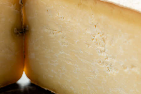 Piece of tasty Ossau-Iraty or Esquirrou sheep cheese produced in south-western France, Northern Basque Country