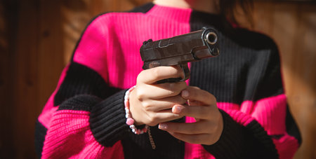 Caucasian young woman holding a pistol.
