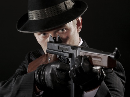 Retro gangster holding machine gun.