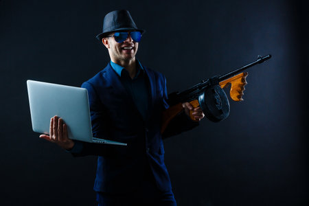Mature gangster in sunglasses dressed in suit with tommy gun