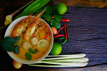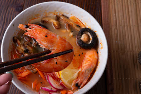 Food and drink, traditional Thai cuisine. Spicy tom yam kung, tom yum sour soup with shrimp, prawn, coconut milk, lemongrass and chili pepper in a bowl on a wooden table