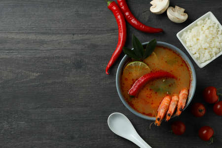Bowl of spicy Thai soup on grunge background