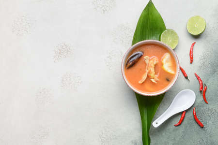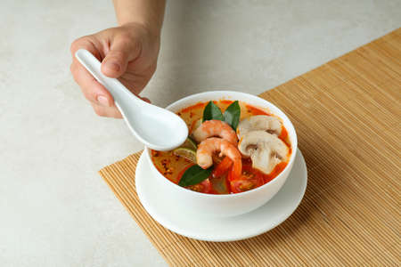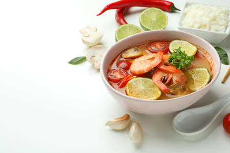 Concept of tasty eating with Tom yum soup on white textured background