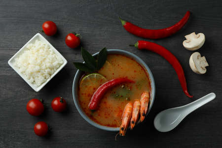 Tom yum soup and ingredients on dark wooden background