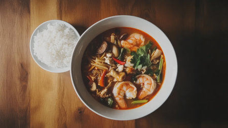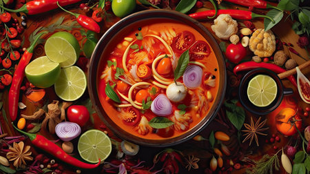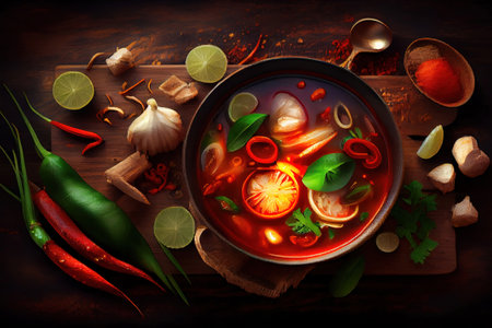 Tom Yum Soup on a table. Top view. Generative AI