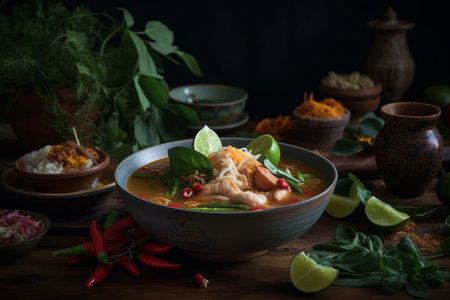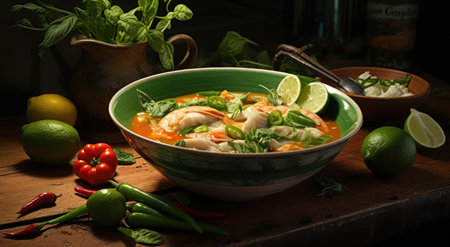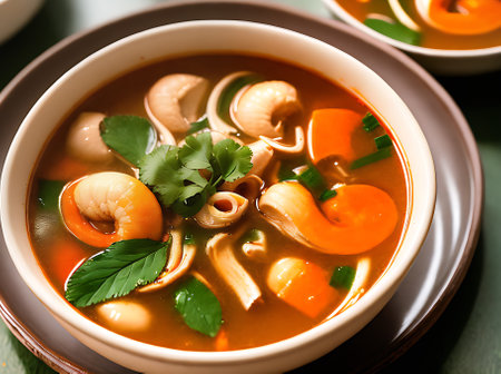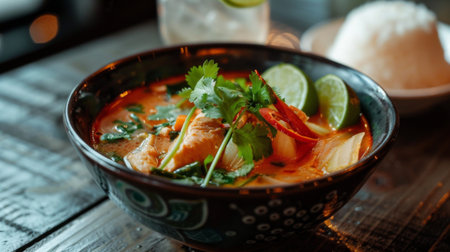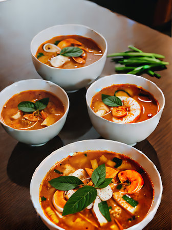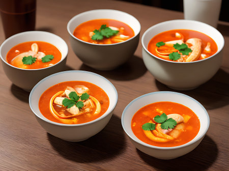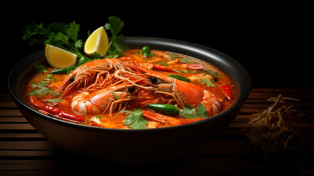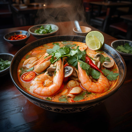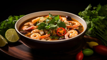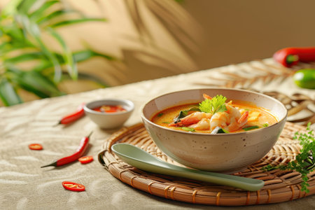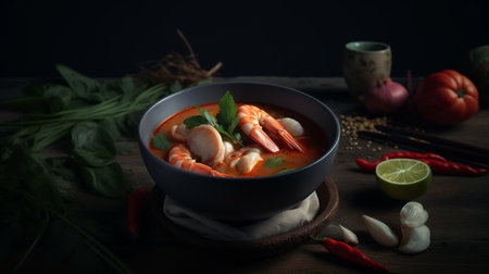 Realistic tom yam soup in a cozy warmlit restaurant with highlydetailed decor and a neutral color palette. Closeup shots show nobody in the space. Generative AI Generated