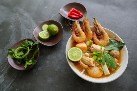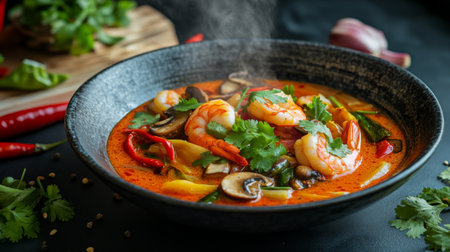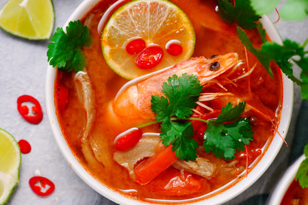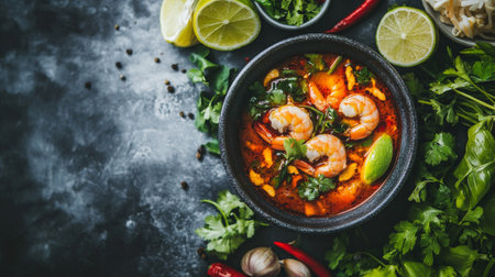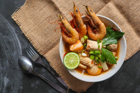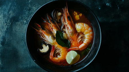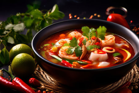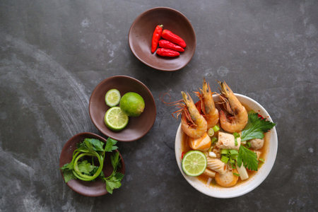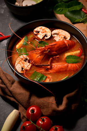 A delicious bowl of spicy Thai soup with shrimp and fresh vegetables, served on a dark background. Concept of Asian cuisine and gourmet food