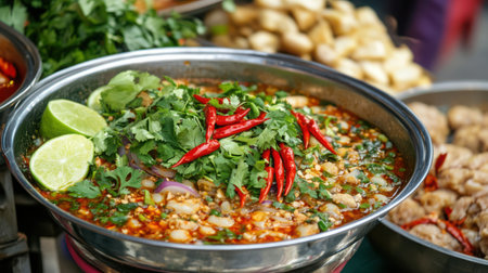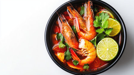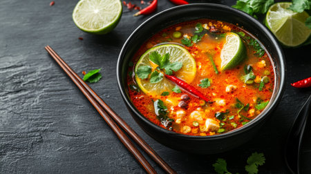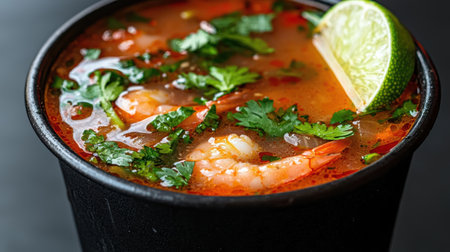 A vibrant bowl of spicy Thai soup featuring fresh lime, chili, and cilantro. Ideal for food lovers seeking savory and aromatic dishes. Perfect for culinary exploration.