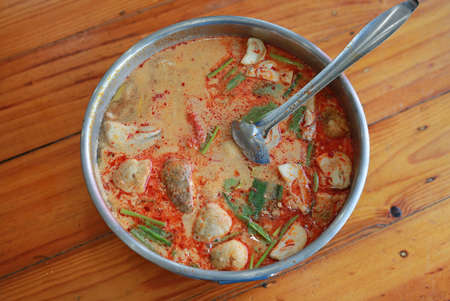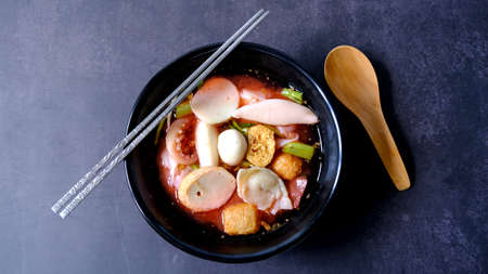 Top view noodles red sauce soup (Yen Ta Fo) served with different fish balls, crispy Squids, fried tofu and Chinese morning glory, Thai food fusion cuisine Style.