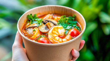 Spicy Thai tom yum soup with shrimp, mushrooms, and herbs in an eco-friendly takeout bowl in female hand. Concept of Asian cuisine, takeaway meal, street food, and flavorful international dishes