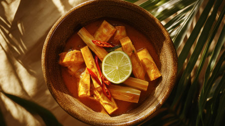 A vibrant bowl of spicy coconut curry featuring fresh lime and chili. Perfect for food lovers, the dish offers a unique blend of tropical flavors.