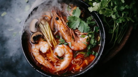 A bowl of steaming hot tom yum goong soup with shrimp, mushrooms, and fresh herbs, the spicy and sour aroma rising from the vibrant broth.