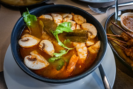 Tom Yam Khung, spicy Thai soup with shrimps and mushrooms, at a restaurant, garnished with cilantro