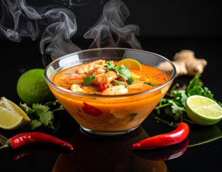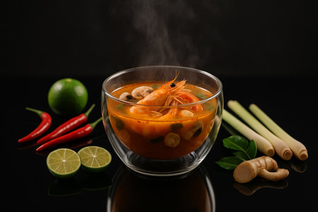 AI generated Aromatic tom yum goong soup served in a modern glass bowl with rising steam, placed on a sleek black glass table with reflective surface surrounding ingredients