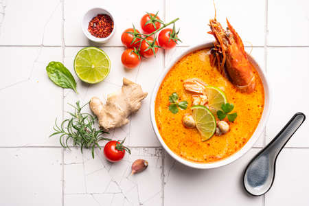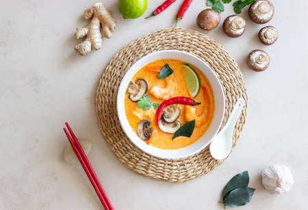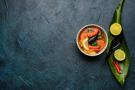 Tom Yam kung Spicy Thai soup with shrimp, seafood, coconut milk and chili pepper in a bowl, top view with copy space