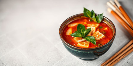 A vibrant bowl of spicy soup showcases fresh vegetables and herbs, perfect for an inviting kitchen setting. Bamboo chopsticks rest nearby, enhancing the experience.