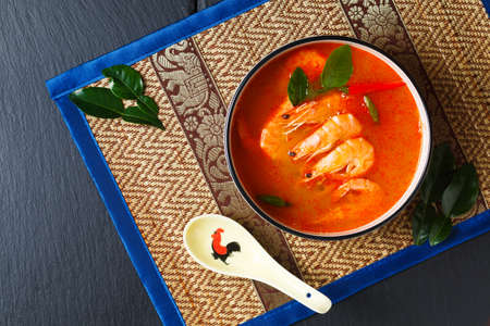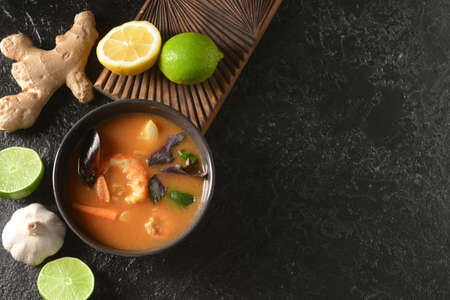 Bowl of spicy Thai soup on dark background