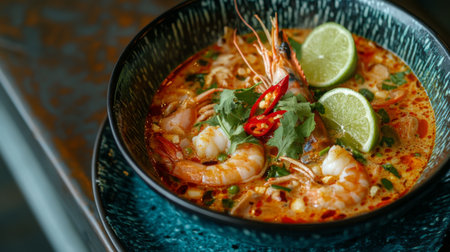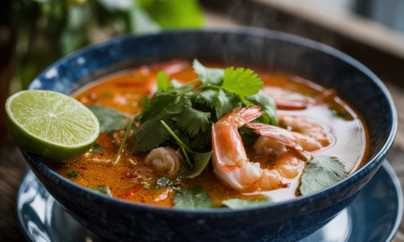 Steaming hot spicy tom yum soup with fresh shrimp, vibrant lime, and green cilantro in a blue bowl. traditional thai cuisine, delicious, healthy, and aromatic food.