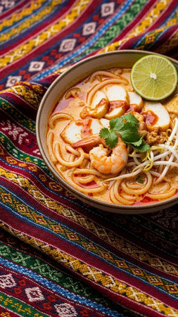 Vibrant laksa noodle soup with shrimp, bean sprouts, and lime on a colorful traditional fabric, perfect for culinary and cultural themes.