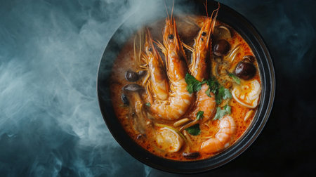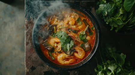 A bowl of steaming hot tom yum goong soup with shrimp, mushrooms, and fresh herbs, the spicy and sour aroma rising from the vibrant broth.