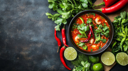 A vibrant bowl of spicy Thai soup featuring fresh lime, chili, and cilantro. Ideal for food lovers seeking savory and aromatic dishes. Perfect for culinary exploration.