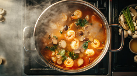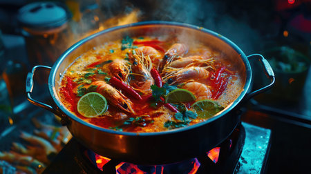 Realistic tom yam soup in a cozy warmlit restaurant with highlydetailed decor and a neutral color palette. Closeup shots show nobody in the space. Generative AI Generated