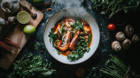Aerial view of a steaming Tom Yum Goong bowl, filled with prawns, mushrooms, and lemongrass, surrounded by fresh Thai herbs on the side.