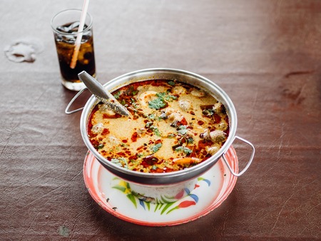Food and drink, traditional Thai cuisine. Spicy tom yam kung, tom yum sour soup with shrimp, prawn, coconut milk, lemongrass and chili pepper in a bowl on a wooden table