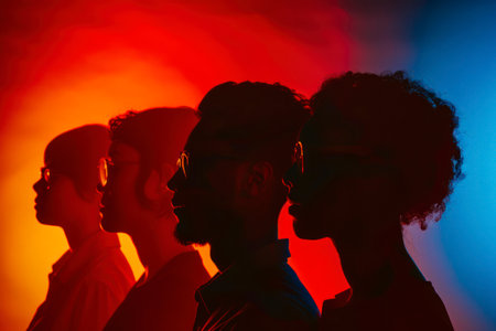 Row of diverse men and women facing sideways with multicolored gradient symbolizing inclusion and equity. Representation of multiracial group.