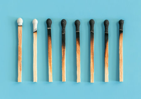 burnt matches arranged on a blue background, close up view of the charred tips, highlighting fire damage and texture, suitable for concepts of destruction, loss, or caution