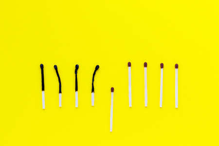Group of burnt out and unused match sticks on yellow background. Preventing of coronavirus / Covid-19 spread by self quarantine. Social distance concept. Stopping the domino effect. Save a community.
