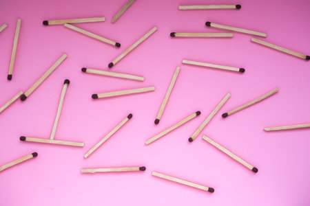 matches, yellow background, minimalistic design, pattern, red tips, flat lay composition, bright colors, contrast, simple arrangement, everyday objects, creative layout, modern aesthetic