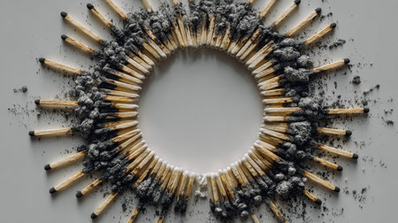 This striking image features a creative arrangement of matches forming a circular pattern, surrounded by gray ash on a light background, showcasing artistic minimalism.