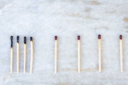 Row of burnt matches in white surface with one black match in the middle symbolizing contrast and opposition