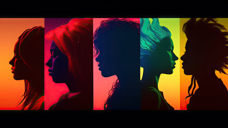 Multiple colorful silhouettes of women highlight unique hairstyles, blending seamlessly into a bright orange and yellow backdrop.