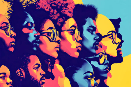 This artwork celebrates African American identity with a vibrant collage of diverse faces, highlighting unity and gender equality through bold colors and shapes.