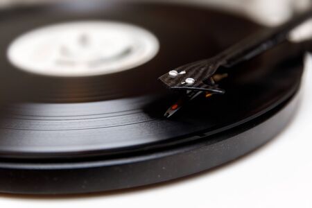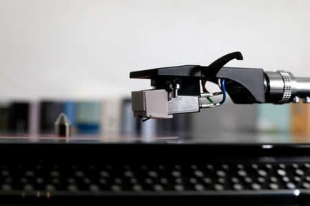 Close-up of a cartridge head on a vinyl record, analog retro music, vinyl disc collecting, vintage equipment