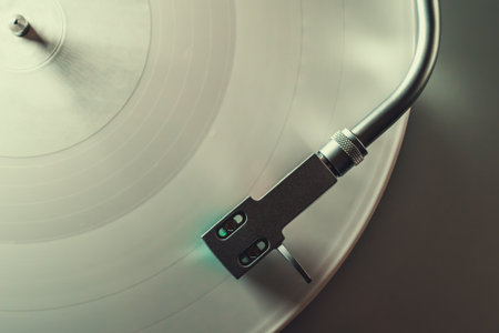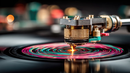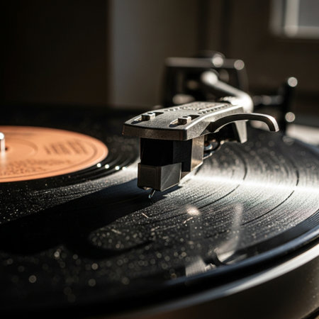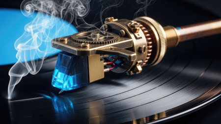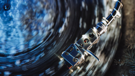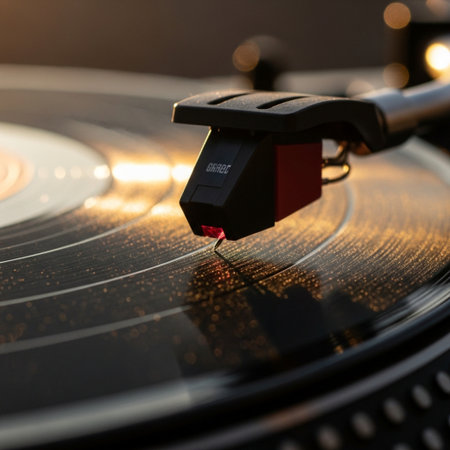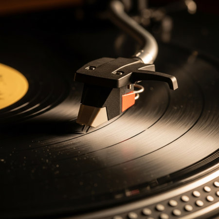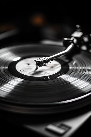 Artistic close-up view of a vinyl record on a turntable, highlighting the stylus and intricate details, evoking feelings of nostalgia and a love for analog music.