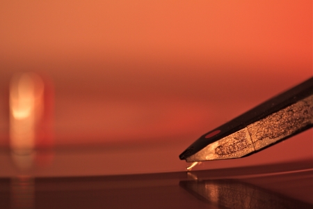 A closeup shot of a gramophone needle with an orange background