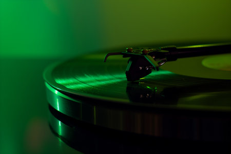 Close-Up of Vinyl Record Player in Green Lighting Perfect for Vintage Music Collections.