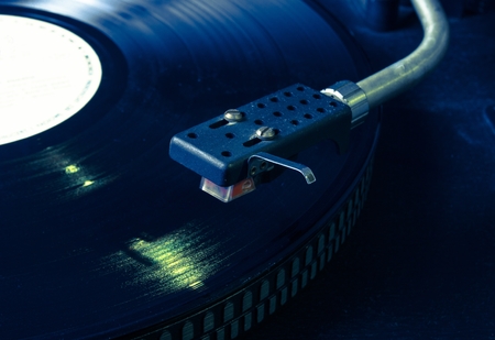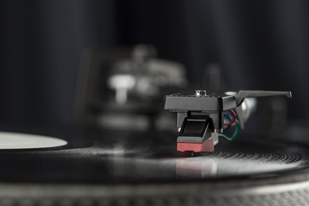 Record player stylus on a rotating disc, Picture of a vinyl record playing.